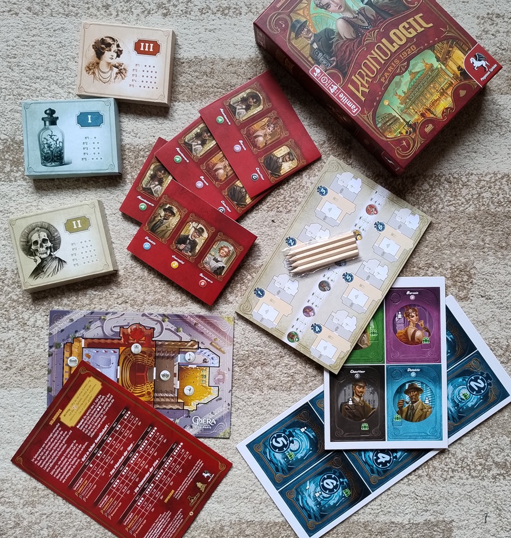 Nun mag ich nicht abgedroschen klingen, aber „Kronologic Paris 1920“ ist tatsächlich leicht zu erlernen, aber schwer zu meistern. Ob das Zehnjährige schon hinbekommen, so wie es auf der Packung abgedruckt ist? Vielleicht, kommt aufs Kind an. Aber Erwachsene werden hier sicherlich viel Spaß haben, gerade auch, da das Spielmaterial (3 Szenarioboxen mit je 30 Karten & einem Heftchen, 1 Ermittlungsblock nebst 4 Bleistiften, 1 Gebäudeplan, 4 Sichtschirmchen & 2x6 Lochkarten) sehr ansprechend gestaltet wurde. Einen ganzen Abend würde ich damit nicht verbringen wollen, aber mal so 1 – 2 Fälle an einem verregneten Sonntagnachmittag, die jeweils vielleicht eine halbe Stunde in Anspruch nehmen, kann ich mir durchaus vorstellen. Deshalb gibt es auch ein positives...