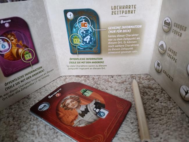 Ist man am Zug, wählt man erst eine Ortskarte der Oper aus und dann entweder eine Personenschablone oder eine Zeitschablone. Die legt man übereinander, sodass man sehen kann, wer wann wo war. Eine dieser Informationen behält man für sich, die andere teilt man mit den Mitspielenden. Und das geht dann reihum, bis irgendwer glaubt den Kriminalfall gelöst zu haben... Das klingt jetzt einfacher als es ist, denn das Zusammenführen der verschiedenen Informationen ist – außer vielleicht im leichtesten der drei Szenarien – eine echte Knobelaufgabe. Gerade im dritten Szenario, wenn der gestohlene Schmuck zwischen der Diebesbande hin und her getauscht wird, sobald zwei Personen (Abenteurerin, Baronin, Chauffeur, Detektiv, Journalist & Serviererin) allein in einem Raum sind. Dabei muss man zudem beachten, dass die Figuren nie stehen bleiben, sondern sich zu jedem der sechs Zeiten in einen anderen, angrenzenden Raum bewegen müssen. Und hier muss man dann logisch denken, denn wenn beispielsweise die Serviererin zum Zeitpunkt 2 im Foyer war, dann kann sie in Runde 1 und 3 einerseits eben nicht im Foyer gewesen sein. Und zugleich kann sie zum Zeitpunkt 1 und 3 jeweils nur auf der Treppe oder in der Galerie gewesen sein, da alle anderen Räume zu weit entfernt sind.