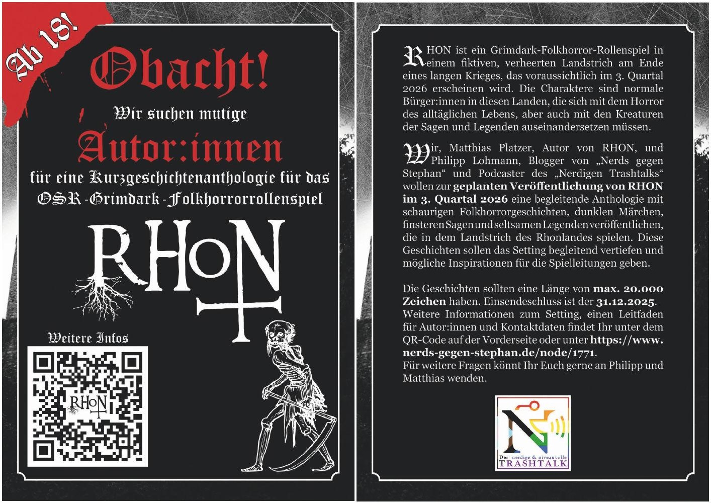 Nun sehen Matthias und ich in der grimmig-düsteren Spätmittelalter-Welt von "RHON" mehr als genug Potential für spannende Kurzgeschichten, weswegen wir kurz nach dem Rollenspiel-Release im 2. Quartal 2026 auch eine Anthologie im 3. Quartal 2026 veröffentlichen wollen. Und genau da kommt IHR in Spiel! Wenn ihr Lust habt auf das Schreiben schaurig schöner Kurzgeschichten, idealerweise mit ca. 20.000 Zeichen (inkl. Leerzeichen), dann schickt uns gern euren Beitrag.