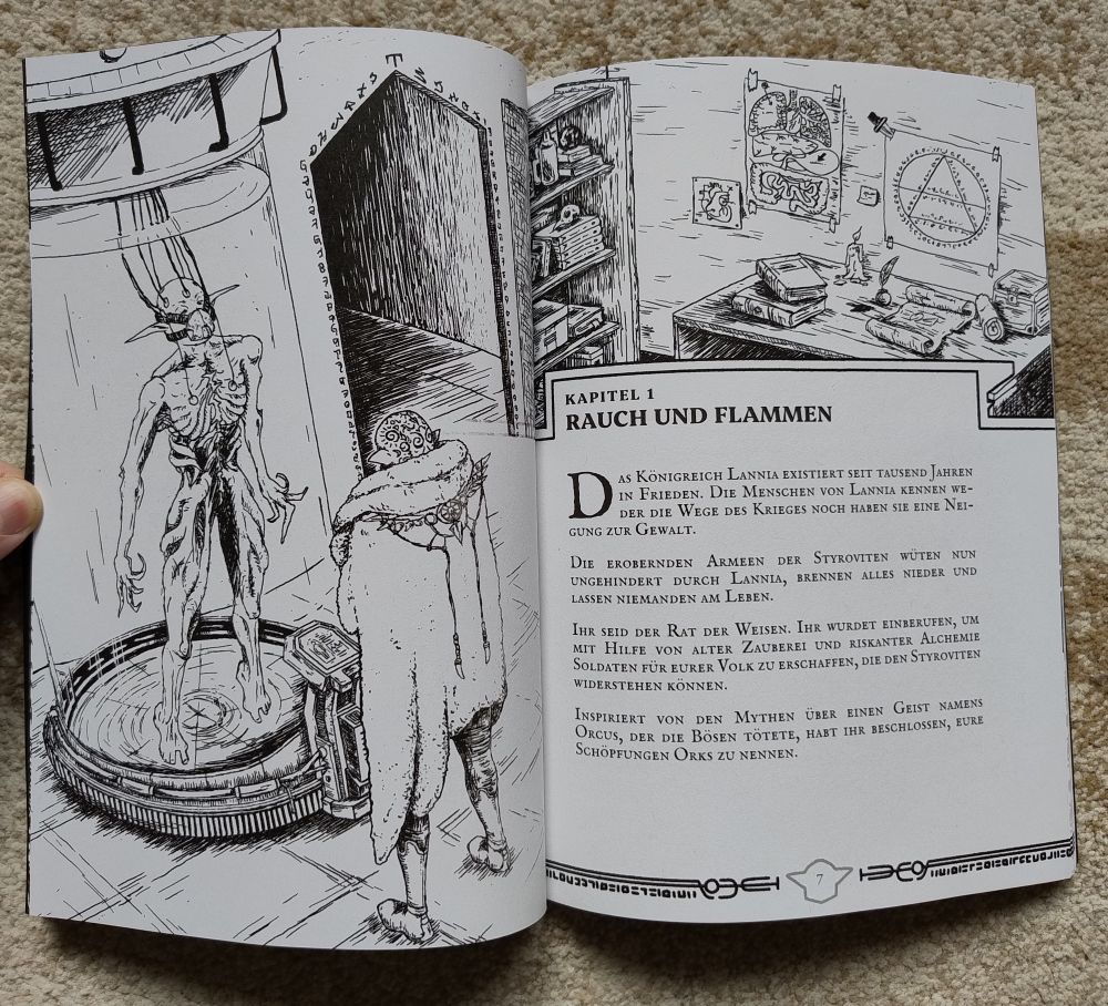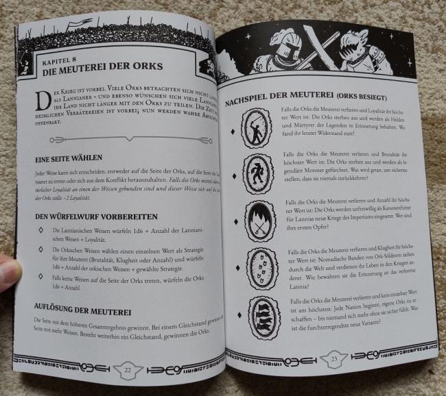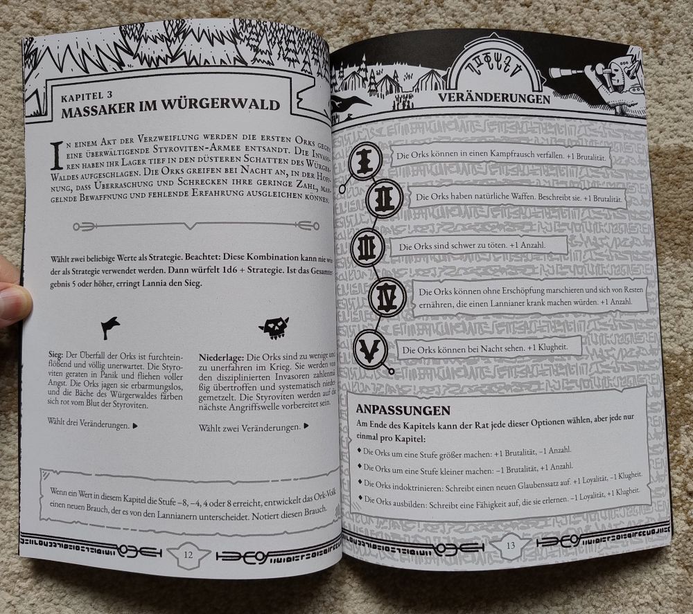 Wie bereits erwähnt ist „Orkdämmerung“ ein spielleitungsloses Erzählrollenspiel mit gerade mal 60 Seiten Umfang. Über acht Spielrunden beziehungsweise Kapitel hinweg wird das Schicksal der Orks reihum erzählt, wobei alle Spielenden sowohl das Schicksal ihrer Heimat als auch die eigenen Interessen in den Vordergrund stellen können. Dabei beginnt man ganz klassisch mit der Erstellung des eigenen Charakters (Name & Motivation) und dann mit der Erschaffung der Orks. Diese werden über die vier Attribute Anzahl, Loyalität, Brutalität & Klugheit dargestellt, wobei sich diese Werte mit jeder geschlagenen Schlacht, aber auch mit den Entscheidungen der Weisen verändern (sind die Orks z.B. freie Wesen oder sind sie an einen Gegenstand oder eine Person gebunden?). Hiernach folgen die verschiedenen Schlachten, welche man regeltechnisch mittels der Kombination zweier Attribute plus 1W6 gegen einen immer schwierigeren Zielwert abhandelt. Dabei darf man im Verlauf der Geschichte jede Attribut-Kombination nur ein einziges Mal benutzen, sodass klassisches Min-Maxing nicht funktioniert. Je nachdem, wie die Schlacht dann endet, kann man dann verschiedene Anpassungen (z.B. Größe ändern oder Orks indoktrinieren) und Veränderungen (Fähigkeiten lernen, wobei das nur narrativ ist, da lediglich die dazugehörige Attributsänderun spielrelevant ist) vornehmen sowie mitunter neue Rituale erfinden.