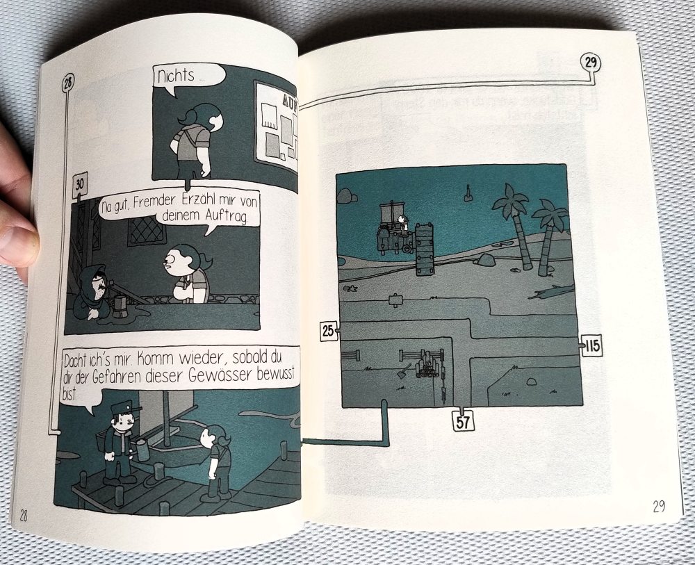 Nun mag ich ja Comic-Spielbücher sehr gern; man muss hier aber deutlich anmerken, dass „Leviathan“ ein ausgesprochen lineares Abenteuer ist, welches spielerische Freiheit (etwa das freie Bewegen auf der Insel) nur vorgaukelt. Es gibt keine Sidequests (auch das wird vorgegaukelt und sofort wieder eingestampft) oder irgendwelche Story-Twists (außer vielleicht die philosophische Auflösung), dafür weiß man aber sehr konkret, was man wie wann wo machen soll. Einmal alle Schauplätze abklappern, die relevanten Infos merken, dann ab zum Zauberer und die große Finalentscheidung treffen. Ende!