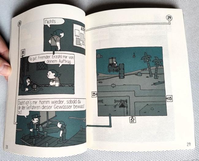 Das Wiedersehen auf dem „Buchmesse Convent“ letzte Woche war jedenfalls sehr herzlich, sodass mir Karo direkt ein Rezensionsexemplar in die Hand drückte. Und das sieht auf den ersten Blick schon mal sehr vielversprechend aus, denn der Autor und vor allem Zeichner Jason Shiga nutzt für sein kleines Abenteuerchen (bei 135 Abschnitten auf 144 Seiten kann man so eine Verniedlichungsform sicher ohne schlechtes Gewissen nutzen) einen zwar simplen, aber sehr knuffigen Zeichenstil, der in seinen Outdoor-Abschnitten auch irgendwie an pixelige JRPGs oder Gameboy-Adventures erinnert. Aber worum geht es denn überhaupt?