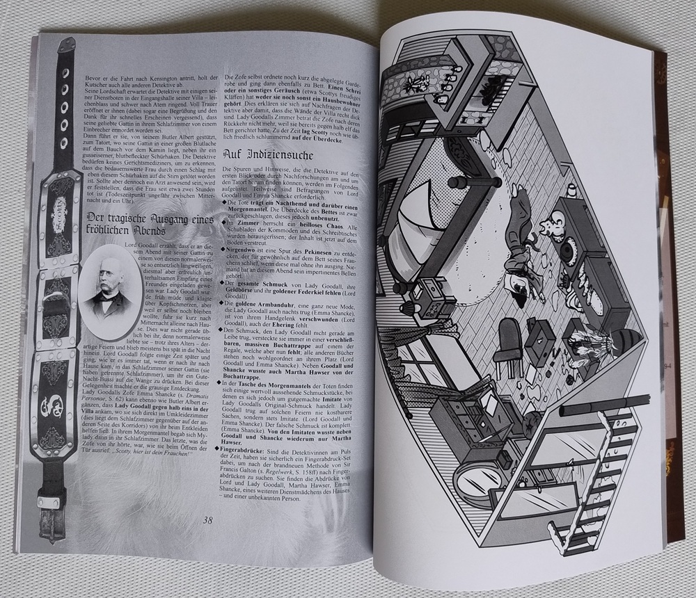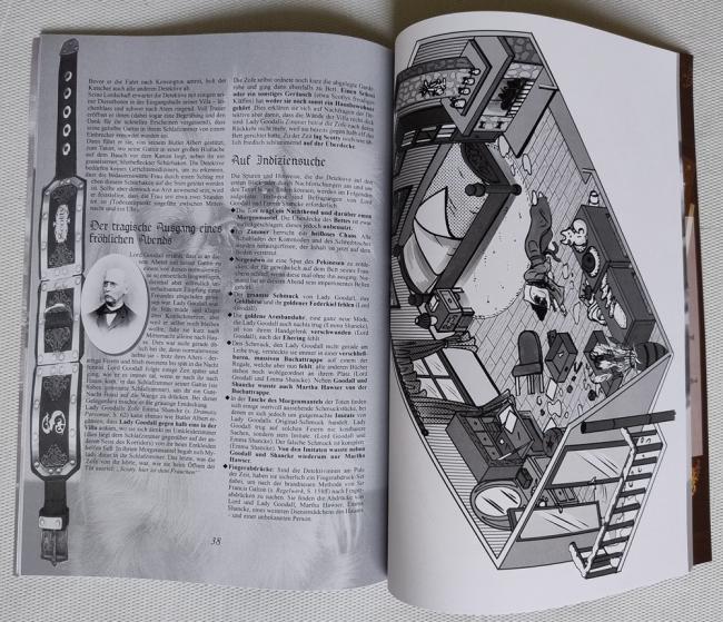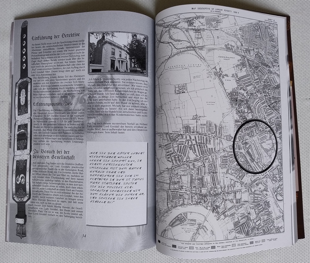 Das zweite Abenteuer „Kleine Fische“ bleib ebenso bodenständig, was mir persönlich grundsympathisch ist, weil ich im Laufe der Jahre schon mehr als genug adelige Skandalmordfälle aufgedeckt habe ;-) Der Schoßhund einer Adelsfamilie wurde entführt, und weil der Lord Goodall es gar nicht einsieht, die absurd hohe Lösegeldforderung zu bezahlen, schickt er die Spielenden auf die Suche. Aber, minimaler Spoiler, so schnell kann man gar nicht die Ermittlungen aufnehmen, wie Lady Goodall einknickt und doch der Erpressung nachgibt... Hätte sie mal lieber nicht gemacht, denn offenbar kam der Entführer nun auf den Geschmack: Tage später liegt die Lady mit eingeschlagenem Kopf in ihrem Schlafzimmer, massivst ausgeraubt und erneut ohne Schoßhund. Ein Zufall? Wohl kaum, denn dafür ging der Täter viel zu zielgerichtet vor. Also vielleicht ein Inside-Job? Genau das gilt es herauszufinden, wofür sich die Ermittelnden u.a. in die dunkelsten Ecken von London und sogar darüber hinaus begeben müssen.