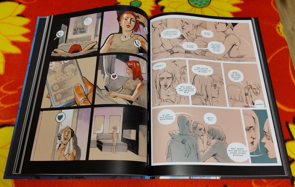 Ja, das war dann auch schon die gesamte Handlung dieses 72 Seiten starken Bildbandes – okay, Comic, aber hier wird schon sehr wenig gesprochen – den man in einer Viertelstunde durchgelesen hat, so man nicht intensiv die Abbildungen zahlreicher kopulierender Körper betrachtet. Was man durchaus tun sollte, denn auch wenn Manolo Carot hier hart das „male gaze“ rausholt, kann man ihm doch nicht absprechen, dass er wirklich hübsch zeichnen kann. Wobei mir die reduzierten Silvesterszenen persönlich besser gefallen haben als die farbenfrohen, expressionistischen und sehr pornösen Sexszenen. Aber das ist Geschmackssache ;-) Die Handlung rund um das eskalierende Partyspiel ist dabei ein netter Einfall, gerade weil die verschiedenen Episoden mitunter zu Diskussionen und Unstimmigkeiten innerhalb der Gruppe anregen. Für mich persönlich überraschend muss ich aber ausgerechnet hier die meisten Kritikpunkte anbringen, denn einerseits sind die zahlreichen Figuren dann doch zu dünn charakterisiert (ich hab mitunter den Überblick verloren, wer da gerade mit wem verbandelt ist und warum jetzt wer auf wen eifersüchtig ist) und andererseits sind die gelegentlichen „Moraldiskussionen“, Deep-Talks oder Charaktermomente dann doch nur ein Feigenblatt, damit man hier nicht direkt von Pornografie sprechen kann. Wenn man etwa das komplexe Thema Sexkauf bzw. Prostitution aufwirft, was eine durchaus valide Diskussion ist, dann sollte man es halt nicht gleich wieder nach einer einzigen Seite beenden, weil es nur die Überleitung zu einer weiteren Sexgeschichte ist. Das ist eine vergebene Chance – Anderen Erotikcomics aus dem gleichen Verlag, beispielsweise „Die Erektion“ (Link), gelingt die Mischung aus ernsthaften Diskussionen und knisternder Erotik deutlich besser. Aber egal, für einen „Splitternackt“-Comic ist „In Vino Veritas“ schon ziemlich gut gelungen, auch wenn es für meinen Geschmack deutlich mehr Drama und etwas weniger Pornografie hätte sein können.