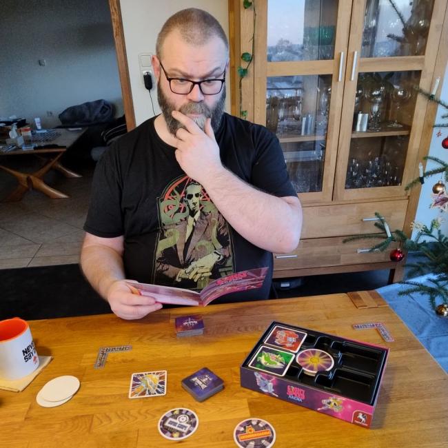 Denn die simple Spielmechanik funktioniert folgendermaßen: Pappplättchen werden gemischt, dann zählt der Timer runter, und man hat pro Raumschiff exakt 10 Sekunden Zeit, um es irgendwo auf dem Spielfeld zu positionieren. Dabei muss man theoretisch die unterschiedlichen Einheitenwerte beachten (Lebenspunkte, Schildausrichtung, Bewaffnung), aber realistisch betrachtet versucht man einfach nur die Laserkanonen halbwegs korrekt auszurichten. Sind alle der bis zu acht Raumschiffe verteilt, fotografiert man das Schlachtfeld mit der Handy-App, damit diese dann das Schlachtgeschehen automatisch durchrechnet und Punkte vergibt. Zack, 5 Minuten rum, Spiel vorbei... Das ist simpel, aber eben auch spaßig, sodass man „Light Speed Arena“ immer mal wieder gern rausholt, wenn man mal 5 – 10, aber allerhöchstens 20 Minuten Zeit hat, bevor der Lieferdienst eine kalte Pizza vorbeibringt ;-) Das ist wohl der snackigste Spielesnack, den man jemals gespielt haben wird!