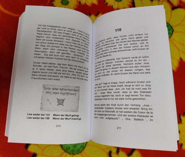 Spielmechanisch hat sich auch diesmal nicht viel geändert, man würfelt wieder mit einem W20 sowohl im Angriff als auch in der Verteidigung gegen einen Zielwert, den es zu unterbieten gilt. Dann wird der Schaden mit einem sechsseitigen Würfel plus Bonus minus Rüstung ermittelt, den man von den Lebenspunkten abzieht. Ist man bei 0, ist man tot, und das kann zumindest beim ausartenden Endkampf recht zügig passieren. Die ganzen Abschnitte davor wird dagegen eher wenig gekämpft (oder ich hab einfach immer genau die richtigen/falschen Entscheidungen getroffen?), wobei die Wahl des falschen Spielbuch-Abschnittes dann trotzdem zum Tot führen kann. Bei meinem Testdurchgang passierte es dabei lediglich einmal, dass ich „ohne Vorwarnung“ starb, denn normalerweise musste man schon ziemlich dumme Entscheidungen treffen oder eine der seltenen W20-Würfelproben (spielmechanisch Angriffswürfe) verpatzen. Wobei ich hier nicht ausschließen möchte, dass ich irgendwo einen Hinweis übersehen habe, denn trotz „nur“ 331 Abschnitten ist die Geschichte doch so verzweigt, dass man selbst bei zwei- oder dreimaligem Durchspielen noch gänzlich andere Spielerfahrungen durchlebt.