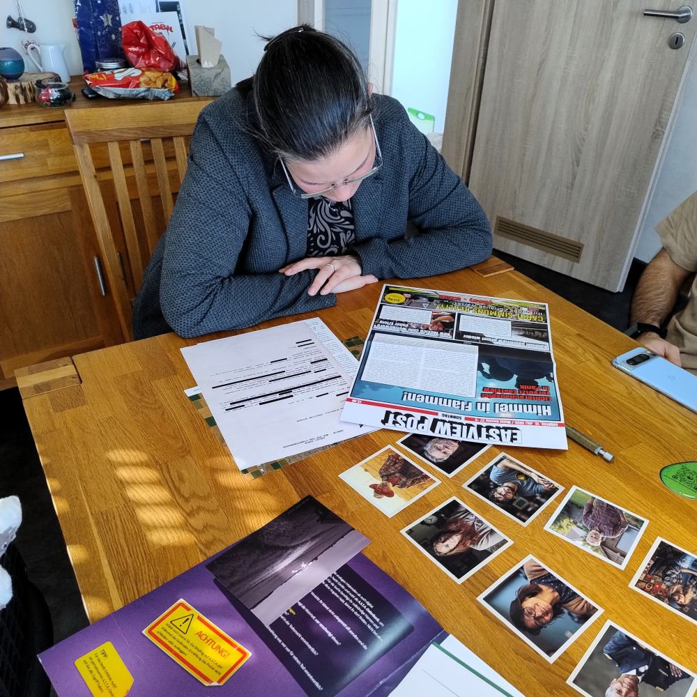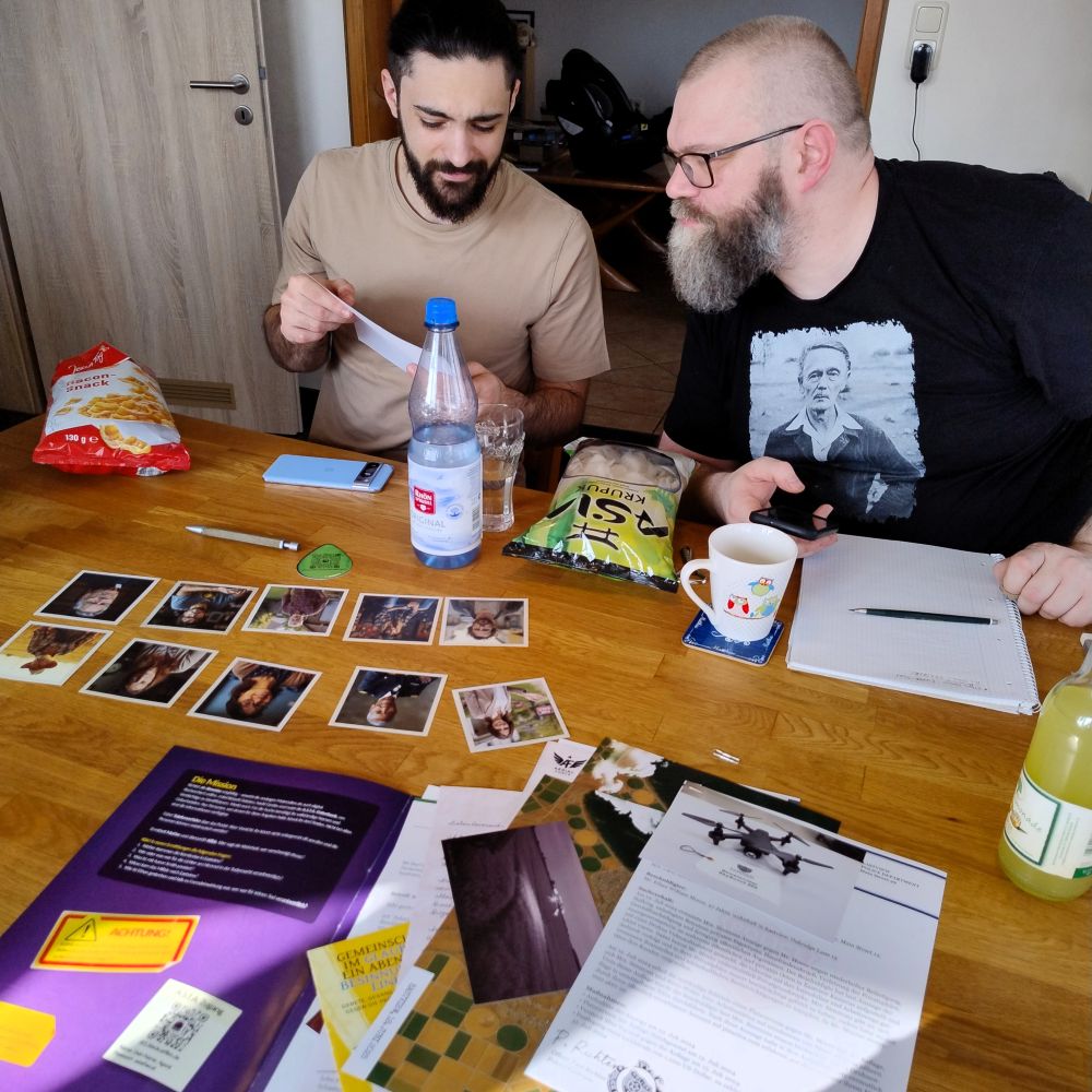 Wie es bei Krimispielen üblich ist muss man sich auch bei den „Black Cat Files“ durch eine ganze Menge an Spielmaterial wühlen. Vieles davon ist „handfest“, also beispielsweise ausgedruckte Polizeidokumente (z.B. Obduktionsbericht und Funkprotokoll), Übersichtskarten, Fotografien, ein Duftbaum (wie geil!) und die obligatorische Kleinstadt-Zeitung, die hinter viel Klatsch und Tratsch auch allerlei entscheidende Informationen versteckt. Vielleicht sogar noch wichtiger ist aber die Online-Recherche, die weitestgehend über ein Geheimbehörden-Ermittlungsportal erfolgt, welches beispielsweise zu den betreffenden Personen alle möglichen Daten gesammelt hat und welches auch erlaubt, dass man unter Vorwand diverse Personen anruft oder auf verschlüsselte Daten zugreift. Das klingt unglaublich mächtig, ist es auch, aber hier wird man aus spielmechanischen Gründen direkt aus der Immersion gerissen. Klar, ich verstehe völlig, dass es eben der Sinn des Spiels ist, dass ich mir erst die ganzen notwendigen Informationen (z.B. Geburtsdaten und Telefonnummern) selbst zusammensuche. Aber wenn ich doch die geheimste Geheimbehörde wo gibt verkörpere, dann sollte ich da doch auch eigentlich so zugreifen können? Da wäre es umgekehrt vielleicht immersiver gewesen, dass die Leute dann Allerweltsnamen haben und ich aus den 30 Max Mustermännern die richtige Zielperson raussuchen muss, indem ich herausfinde, wie das Geburtsdatum lautet. Aber okay, „Arcane Gossip“ (die mir dankenswerterweise ein Rezensionsexemplar zur Verfügung stellten) ist ein Indie-Kleinstverlag, da muss man spielmechanische Kompromisse akzeptieren. Dazu kommen dann noch allerhand Fake-Webseiten und sogar Podcasts, die wirklich gut gemacht sind. Aber, und das dürfte für einige meiner Lesenden vielleicht relevant sein, dieses „wirklich gut gemacht“ kommt vor allem dadurch zustande, dass massiv mit generativer KI gearbeitet wurde. Das ist in einigen Fällen verständlich (selbst ein größerer Verlag würde sich schwer tun, UFOs am Himmel fliegen zu lassen), in einigen Fällen – nämlich vor allem, wenn es um das gesprochene Wort geht – reißt es aber manchmal aus der Immersion. Zudem haben wir uns mit zwei Beweisstücken sehr schwer getan, weil wir die darin versteckten Hinweise für KI-Unsauberheiten hielten. Den Fall haben wir dann aber trotzdem geknackt, also wir waren in keiner Sackgasse, aber vielleicht wären wir dann noch einen Tick schneller fertig gewesen mit einer etwas besseren Endwertung ;-) Gebraucht haben wir übrigens 155 Minuten, was so halbwegs genau in der Mitte der angegebenen 120 – 240 Minuten Spielzeit lag. Dabei waren wir auch ziemlich erfolgreich, lediglich eine Frage hat uns wirklich um den Schlaf gebracht. Und Achtung, jetzt folgt ein Spoiler, also schnell weiter zum nächsten Absatz scrollen, falls ihr den Fall noch spielen wollt: „UFOs über Eastview“ vermittelt mir die ganze Zeit, dass all das Mysteriöse da draußen rational erklärbar ist. Und dann sind da plötzlich wirklich Aliens, was sich irgendwie nicht so richtig in das Gesamtnarrativ des Falls einfügen wollte.